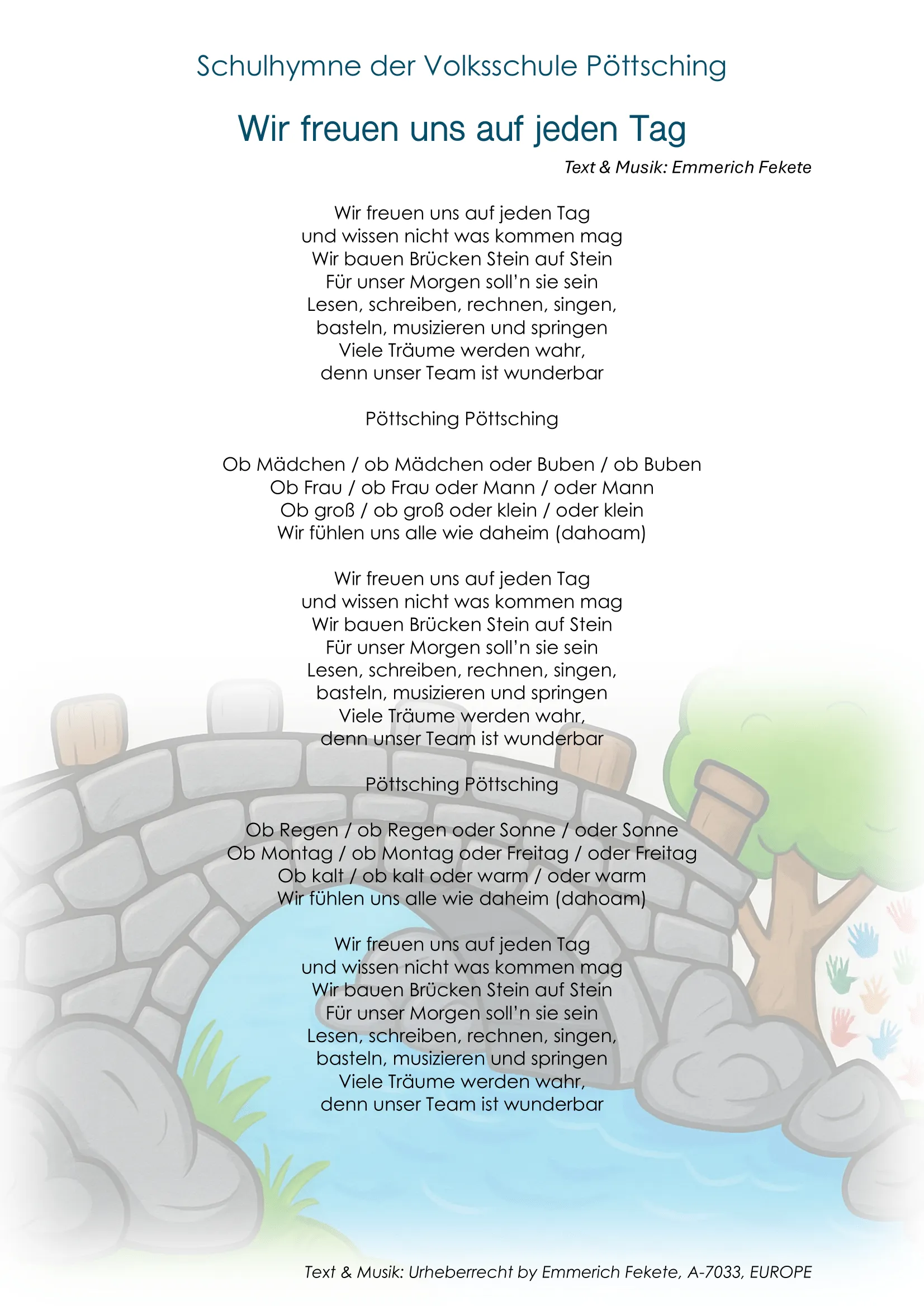 Im Schuljahr 2024/25 hat uns dankenswerterweise Herr Emmerich Fekete eine Hymne mit dem Titel „Wir freuen uns auf jeden Tag“ komponiert, welche erstmals am Schulschlussfest im Juni von unseren Kindern gesungen wurde.