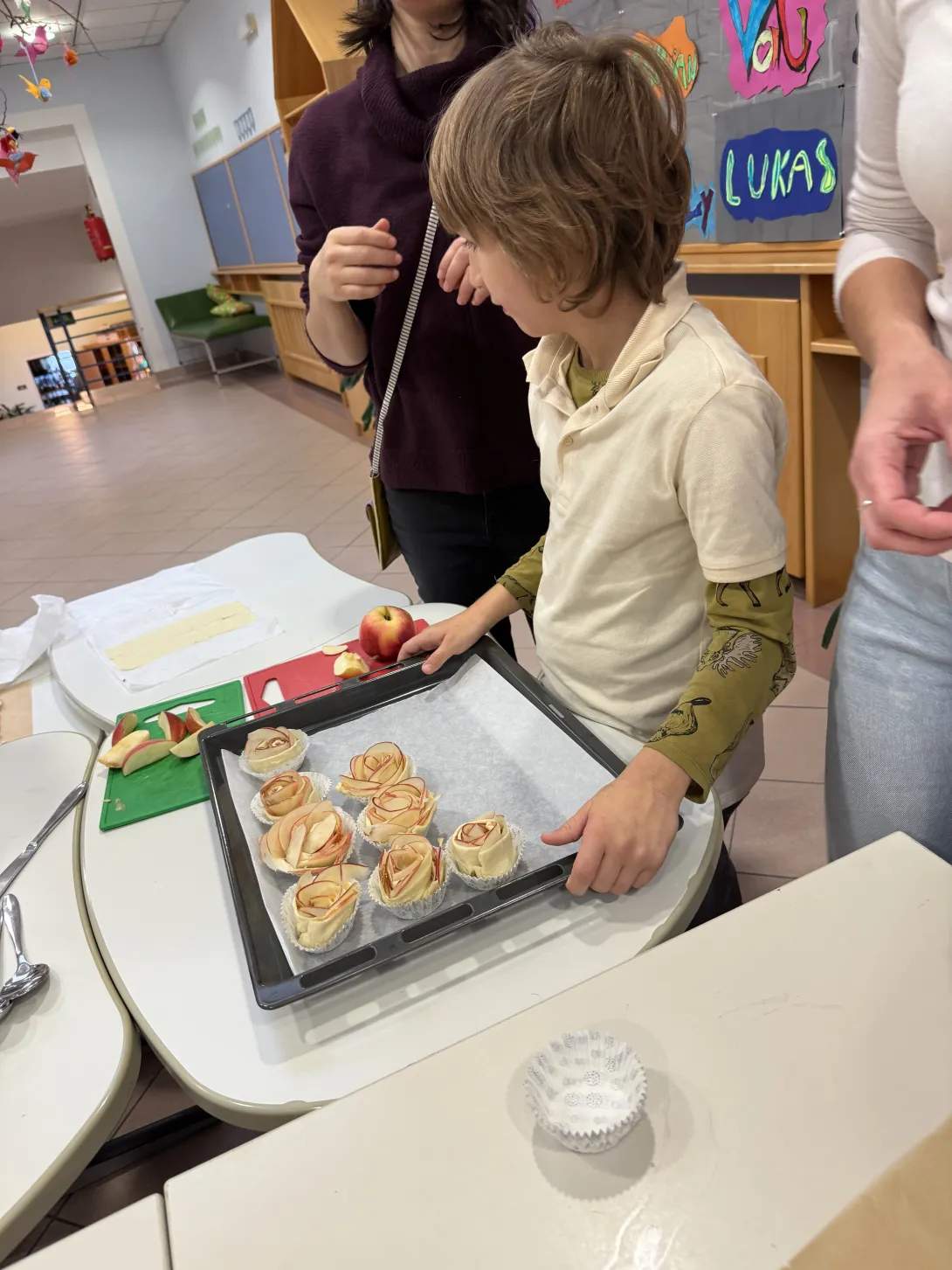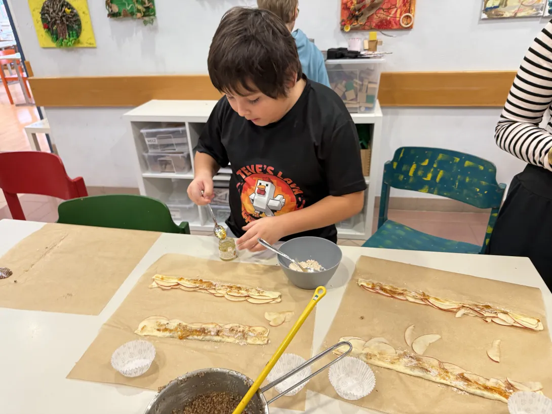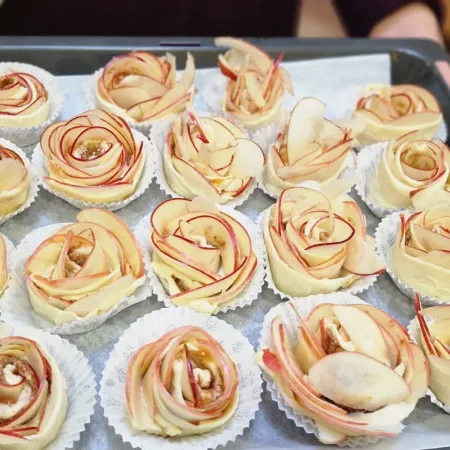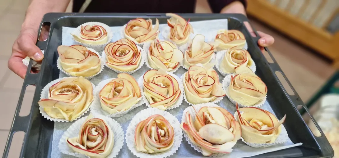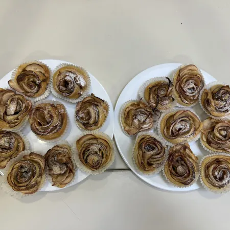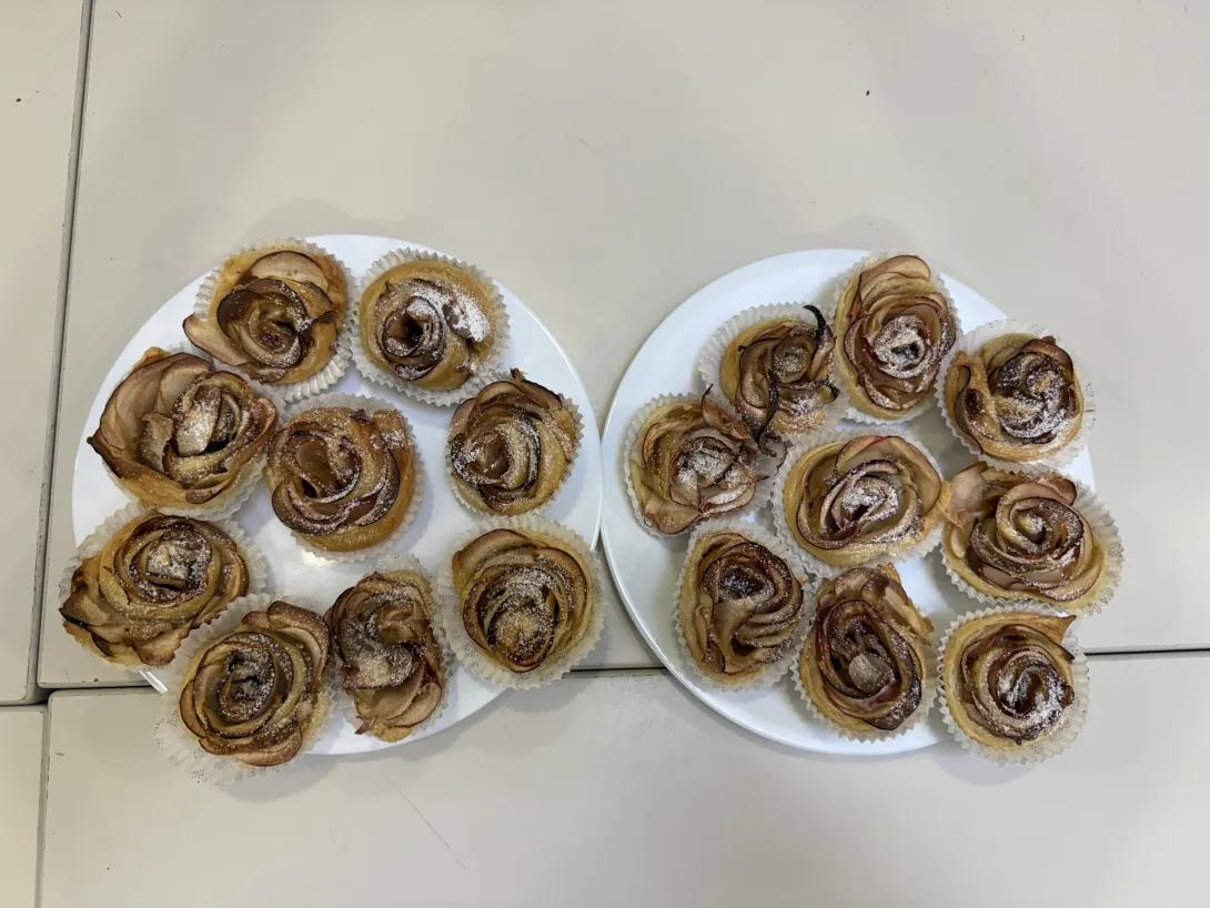 Mit viel Freude und Teamarbeit wurden die Äpfel dünn geschnitten und auf den Blätterteig gelegt. Anschließend wurde die zuvor hergestellte Zimtmasse auf den Teig gegeben und in kleine Rosen geformt.