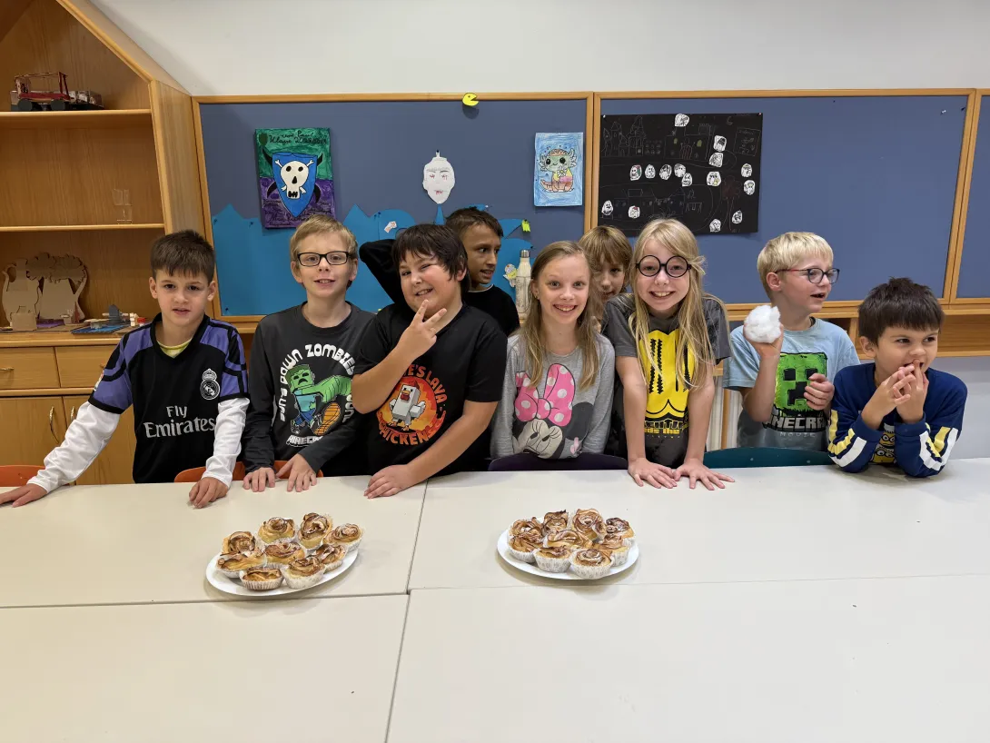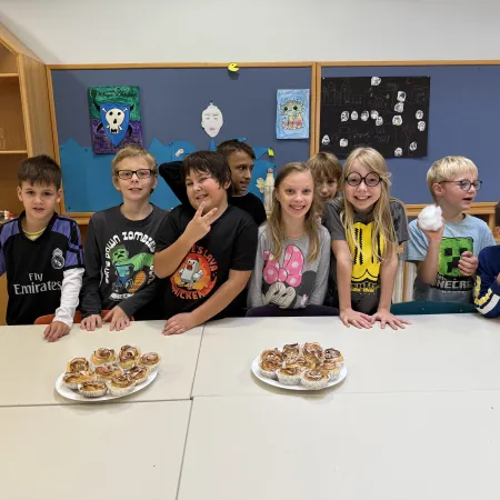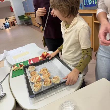 Anfang Oktober duftete es in unserer Schule nach Äpfeln und Zimt. Die Kinder der Kooperationsklasse bekam Unterstützung aus den 4. Klassen. Gemeinsam wurden Apfelrosenmuffins gebacken.
