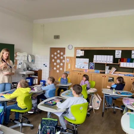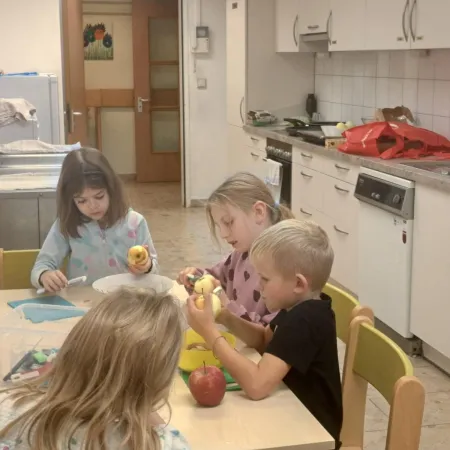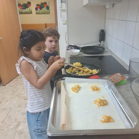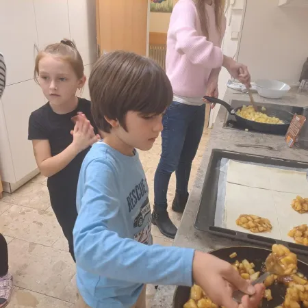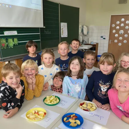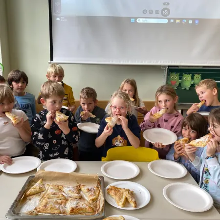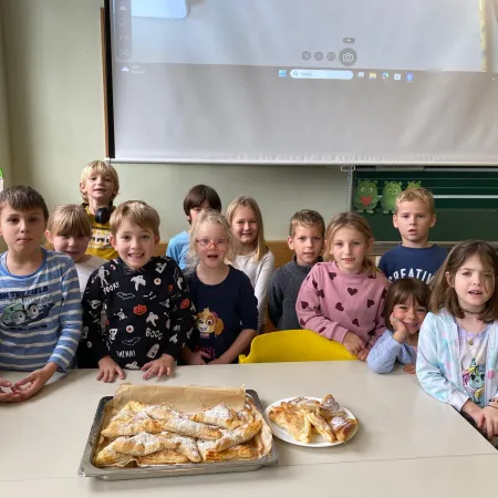 Sie kosteten verschiedene Sorten, malten bunte Apfelbilder, lasen Geschichten und sangen ein Lied über den Apfel. Ein besonderes Highlight war das Backen. Mit viel Freude und Eifer wurden in der Schulküche leckere Apfeltaschen zubereitet.