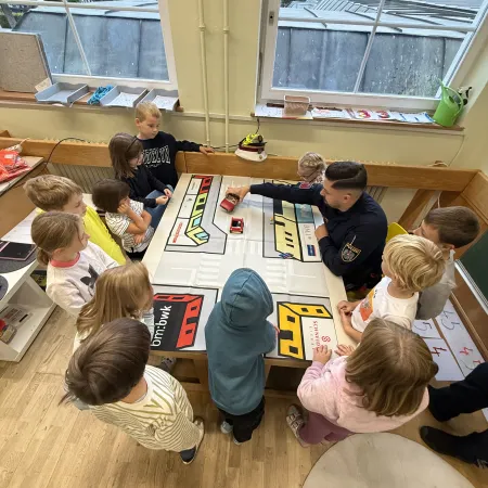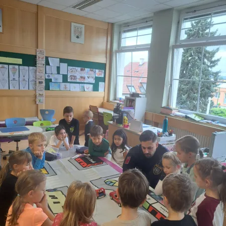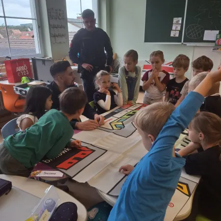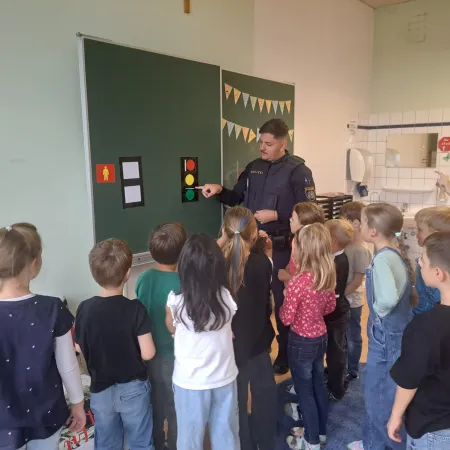 Am 01. Oktober besuchten zwei Polizisten die ersten Klassen. Erst wurde im Klassenraum über den Straßenverkehr sowie das richtige Verhalten während einer Fahrt im Auto gesprochen.